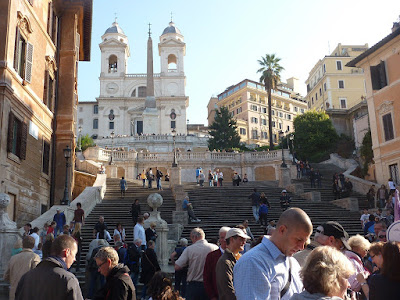 Nu weer verder naar de Spaanse Trappen (Scalinata della Trinit dei Monti) op het Piazza di Spagna. Voor de trappen bevindt zicht een fontein ontworpen door Bernini: Fontana della Barcaccia (letterlijk: Fontein van de lekkende boot). De trappen leiden naar de kerk Trinita dei Monti, die in opdracht van Lodewijk XII is gebouwd. De Fransen wilden deze kerk verbinden met het plein, en vandaar de trappen.