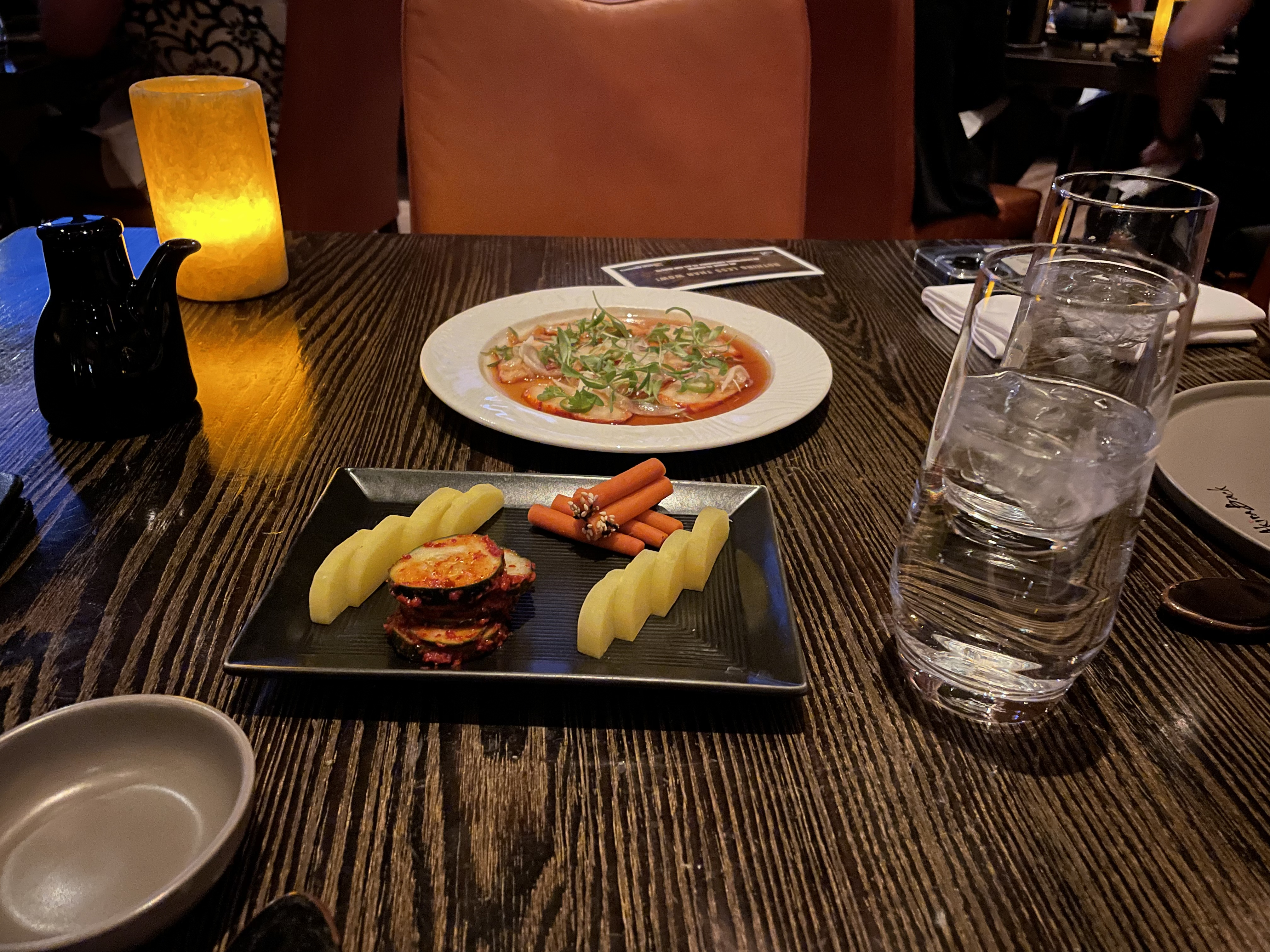 Om iets voor 8en zijn we er en we moeten nog even een paar minuten wachten. Dan worden we naar onze tafel gebracht. Bij dit restaurant heb je uitzicht op de fontein, dus elk kwartier zien we een deel van de fonteinshow. We beginnen met 2 sushirollen, carpaccio van kreeft en wat zure groenten. Het smaakt ons erg goed, en 1 sushirol is zonder rijst, maar met krab, zalm, tonijn en makreel. Deze smaakre verrassend goed!